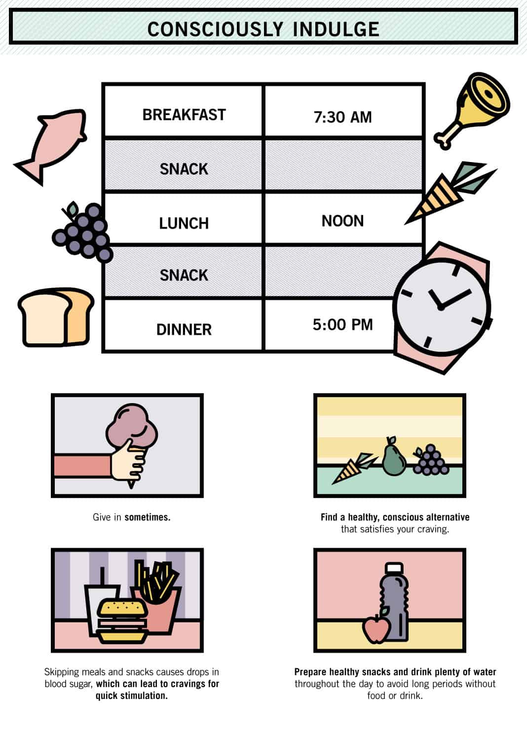Give in … sometimes. The ability to recognize a craving and consciously cave in to it is important. The more you avoid a craving and try and find other foods to fill the need, the greater the possibility of overdoing it once you finally allow yourself to indulge. You may really want a cookie, but instead you opt for celery for a little crunchiness, then a handful of dried fruit for sweet, then some pretzels for salty, and then finally you give in to the cookie. Making a conscious decision, on occasion, to have a small portion of what you crave is sometimes a better option. (Work to limit the indulgence to a small portion versus a full day, or a week of indulgences.)