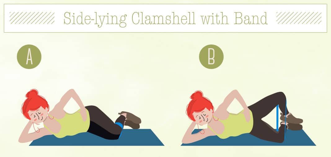 - Super set with: side-lying clamshell with bands: 3 sets, 10 reps each side