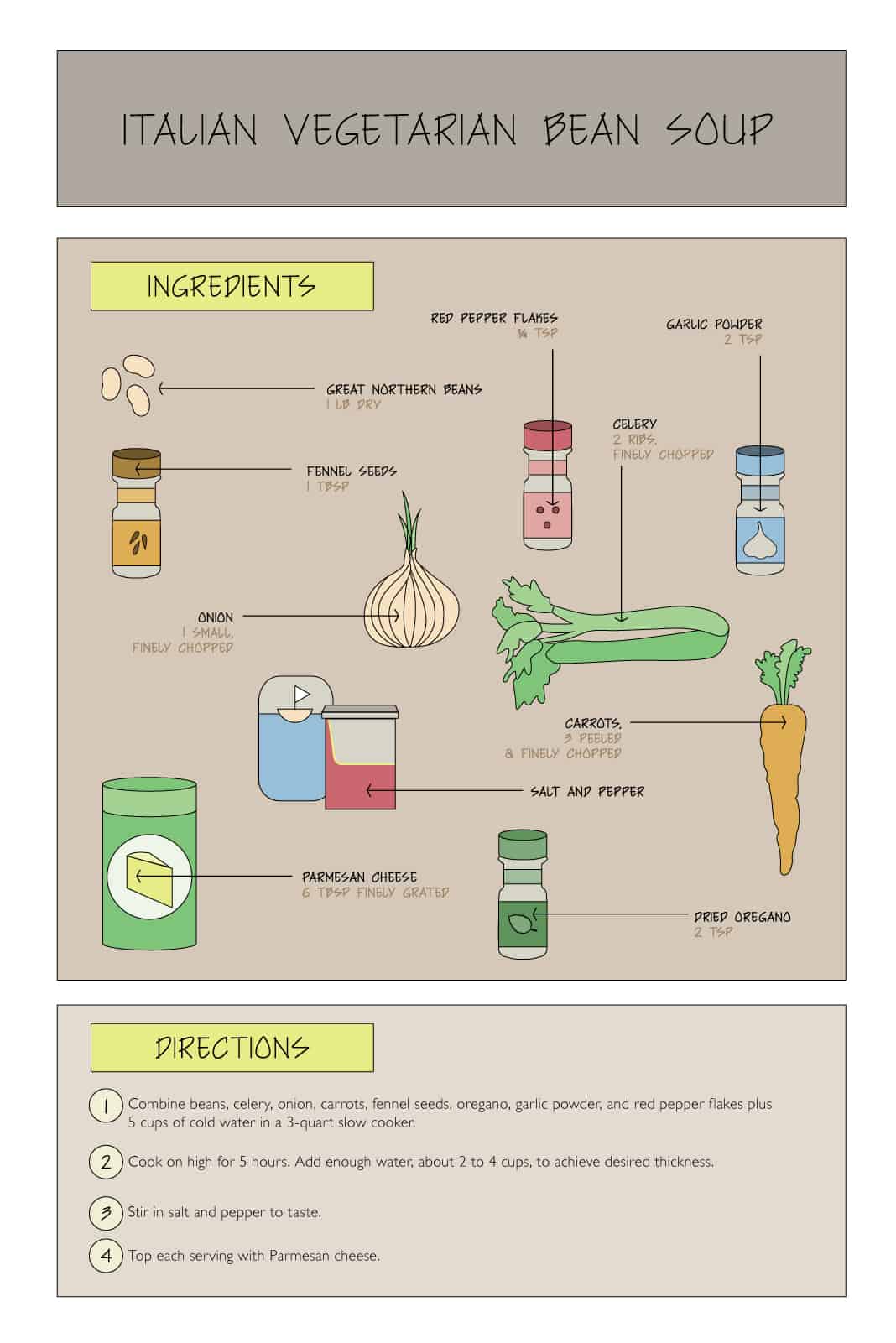 Combine beans, celery, onion, carrots, fennel seeds, oregano, garlic powder, and red pepper flakes plus 5 cups of cold water in a 3-quart slow cooker. Cook on high for 5 hours. Add enough water, about 2 to 4 cups, to achieve desired thickness. Stir in salt and pepper to taste. Top each serving with Parmesan cheese.