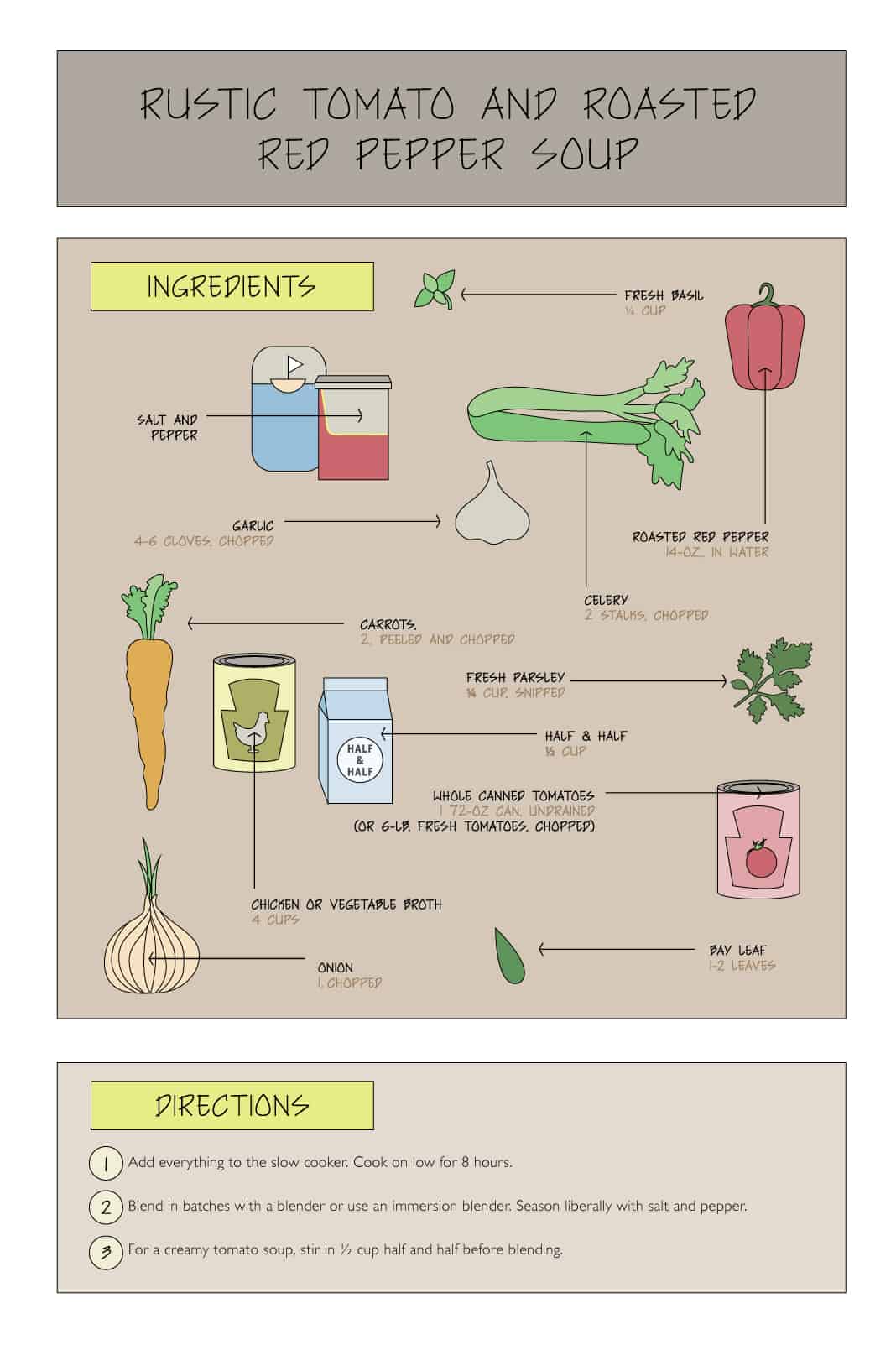Add everything to the slow cooker. Cook on low for 8 hours. Blend in batches with a blender or use an immersion blender. Season liberally with salt and pepper. For a creamy tomato soup, stir in ½ cup half and half before blending.