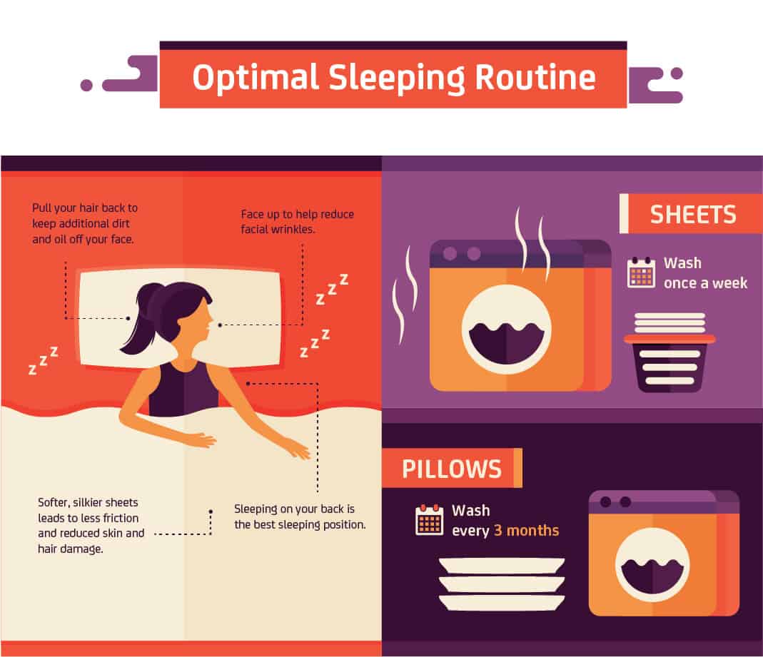 When comes to actual sleep positioning, aestheticians suggest back sleeping. There’s no scientific evidence, but back sleeping does prevent the face from making contact with a pillow, and perhaps decrease the chance of wrinkles. Some studies do suggest that burying our faces into a pillowcase for extended periods of time every night may be associated with increased wrinkle formation, yet others find no connection. Smooth satin sheets may also help: The silkier fibers lead to less friction compared to traditional cotton fabric, translating into less potential skin and hair damage. Others believe the material has frizz fighting effects and is less likely to suck hair of natural oils.