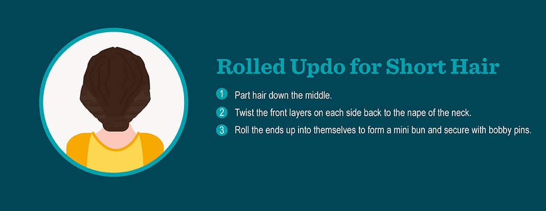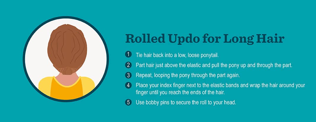The rolled updo, which creates a low ponytail first, also works with long hair.