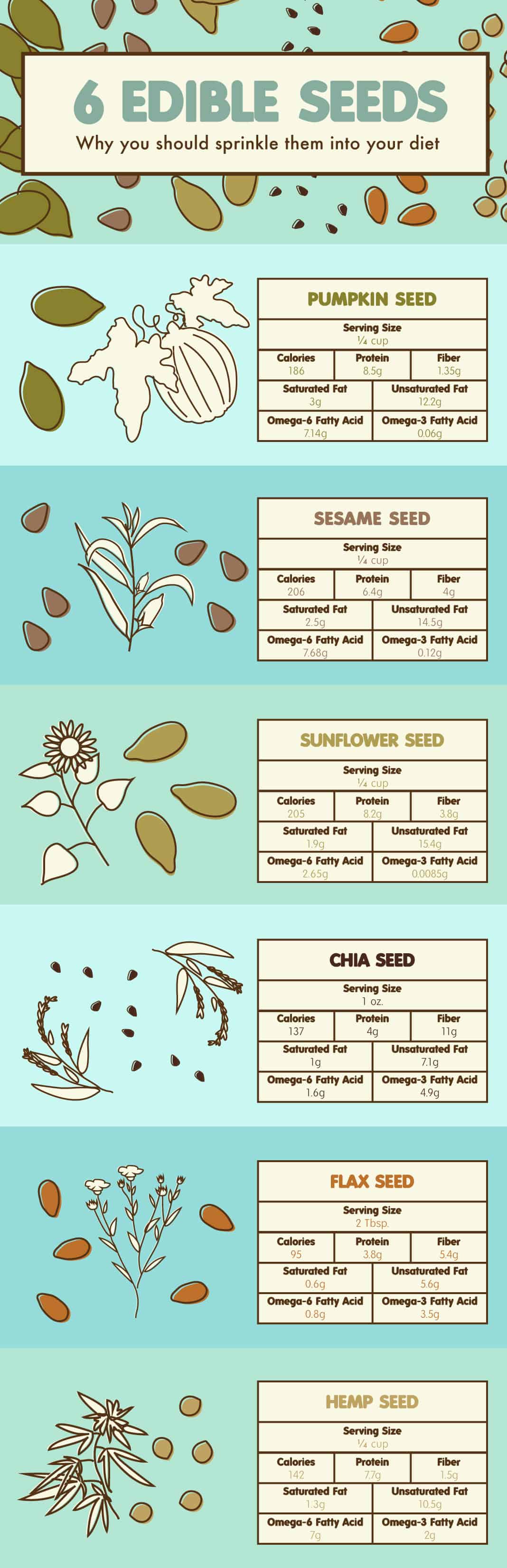 Hemp is an extremely versatile plant that boasts nutrients not found in other seeds. These seeds are a key food source for vegetarians and vegans because they are a plant-based protein containing all nine essential amino acids (meaning they are a complete protein). Just one-quarter cup provides more than 7 grams of protein. Like other seeds, hemp is a rich source of omega-3 fatty acids, which can help prevent heart disease and stroke. But keep in mind that hemp contains more omega-6 fatty acids than other seeds. Eating these seeds, which are also a great source of magnesium, may help regulate blood pressure and blood sugar.