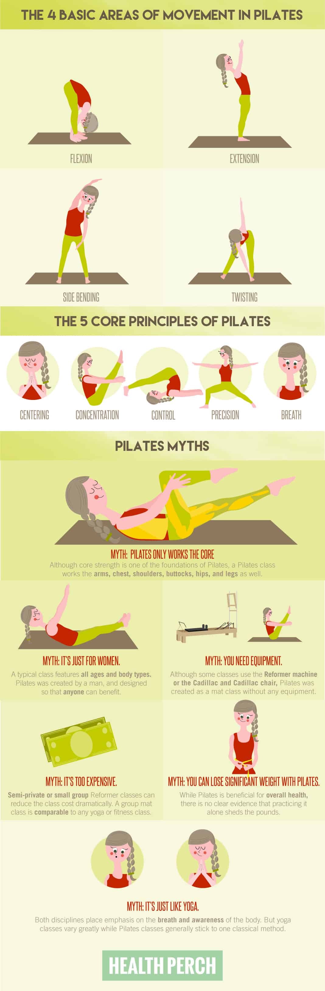 Although core strength is one of the foundations of Pilates, there is much more to a class than just working out the abdominal and postural muscles. The Pilates system is designed to promote stability, mobility, strength, and flexibility in both the intrinsic (deeper) and extrinsic (superficial) muscles of the entire body. Each class involves exercises in four basic areas of movement: flexion, extension, side bending, and twisting. Although core stability is necessary for efficient movement in all of these areas, a Pilates class works the arms, chest, shoulders, buttocks, hips, and legs as well.