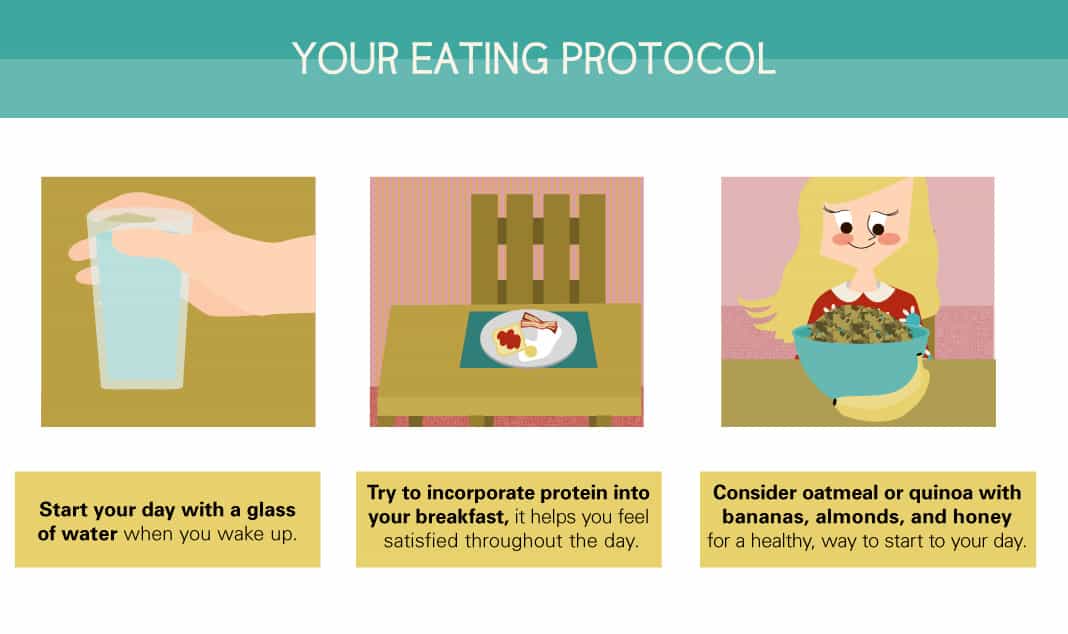 Breakfast is the most important meal of the day. Holistic health coach Tracey Lemle says an eating routine shouldn’t be strict or like you’re being forced to do something. “Our bodies respond really well to repetition even when it comes to eating. It’s like muscle memory but for our stomachs,” she says. Once you wake up, drink a glass of water and try to incorporate protein into your breakfast. Protein helps us feel satisfied throughout the day. Consider oatmeal or quinoa with bananas, almonds, and a little honey for a healthy, easy, low-cost start to your day.
