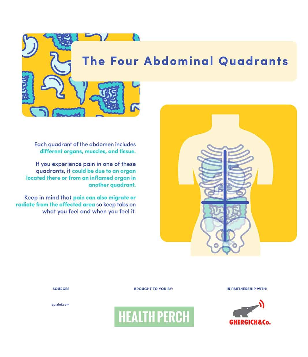 To get started, let’s take a look at the organs that make up your abdomen, keeping in mind that not every organ fits neatly into just one quadrant. Moreover, pain can radiate, so pain in your upper right quadrant could be caused by an inflamed organ located in your lower right quadrant. Organs residing in the chest or pelvic areas are close enough to the abdomen to occasionally cause discomfort there as well. Use this list as a starting point, but keep in mind that there’s more to diagnosing your pain than just this anatomy lesson.