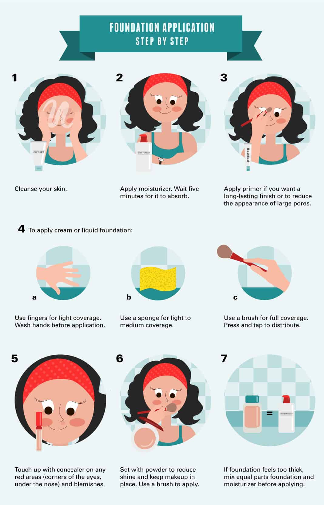To apply a cream or liquid, use your fingers, a brush, or a sponge. Applying with fingers gives the lightest coverage and most control, but wash hands first to avoid transferring any dirt or bacteria to your face. Use a sponge for light to medium coverage and a brush for full coverage. Instead of wiping the brush across your face, press and tap to distribute; wiping will create a caked-on look. Touch up with concealer on any red areas (corners of the eyes, under the nose) and blemishes. Set with powder to reduce shine and keep makeup in place. Use a brush to apply powder, but keep it light; you can always add more.