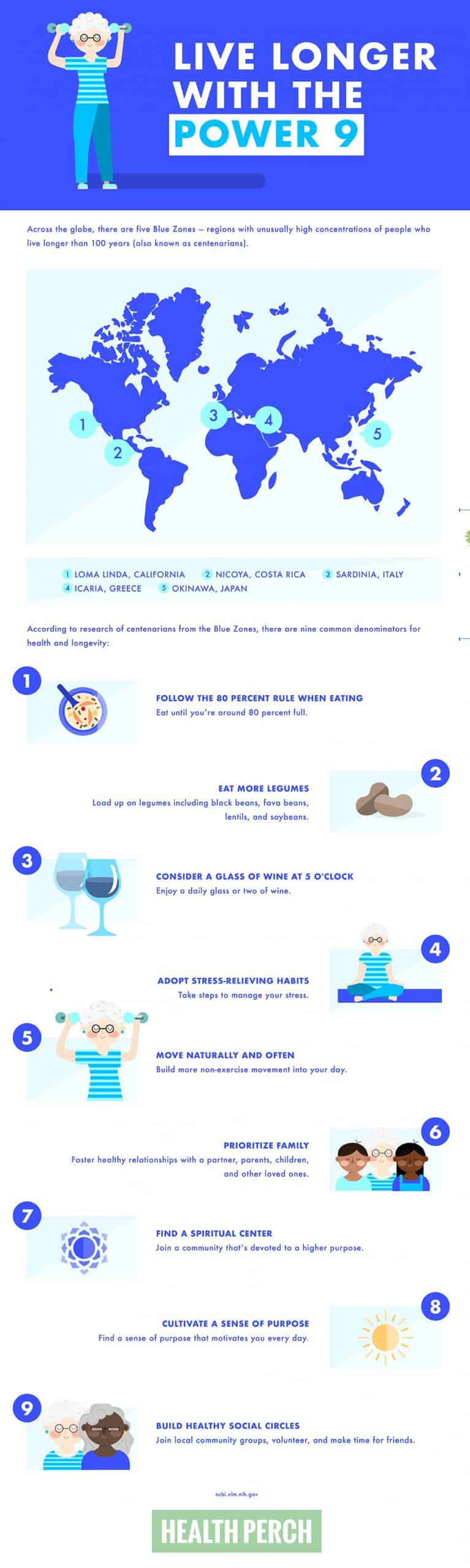 Researchers haven’t invented a pill for infinite life (at least not yet), but they have figured out that it’s possible to increase your lifespan — no magical spring water required. You also don’t have to win the genetic lottery to add a decade or more to your life. It’s possible to live not only a longer life but a healthier one too with the adoption of some important lifestyle changes, as evidenced by the world’s Blue Zones. These zones, which represent five regions with unusually high concentrations of centenarians, or people who live longer than 100 years, may hold the key to a long and healthy life.