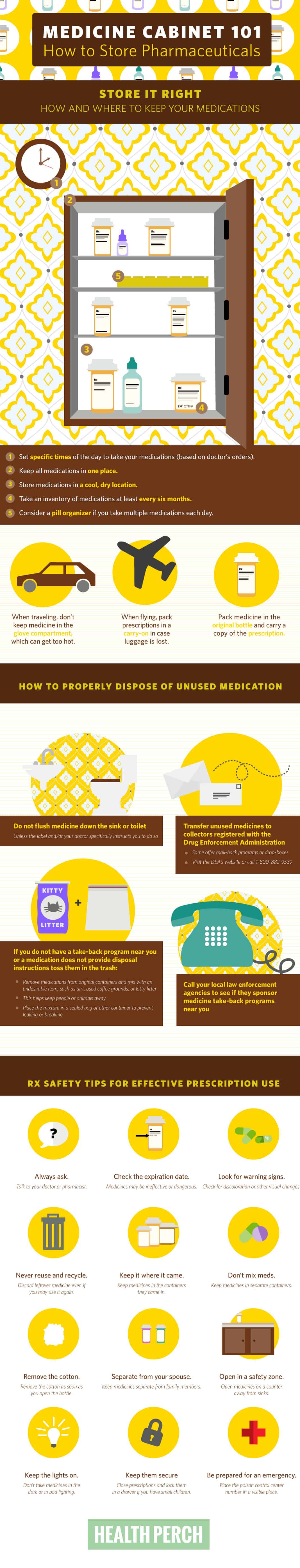 When choosing a place to keep prescriptions, seek a spot that stays cool and dry, such as a kitchen drawer away from appliances (heat and moisture can damage pills). For this reason, a medicine cabinet in the bathroom may not live up to its name, unless the bathroom is well ventilated with fans or windows.