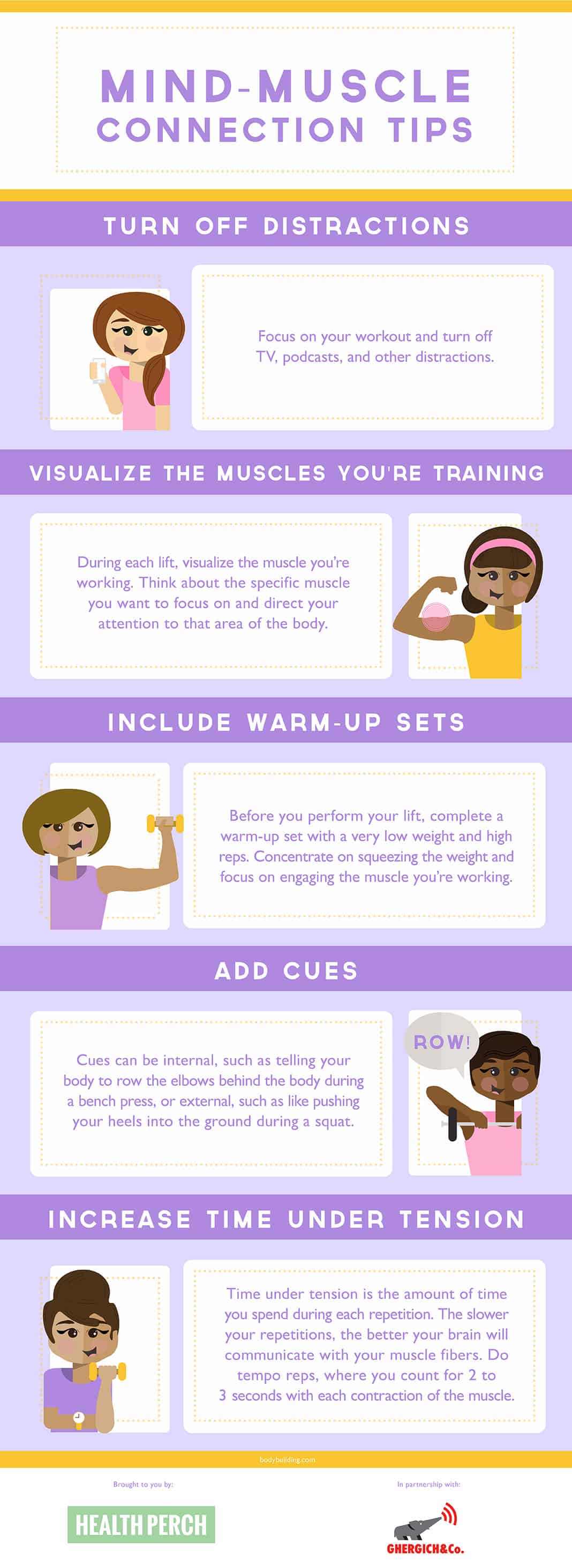 When you focus on using specific muscles to create contractions, the brain calls upon a greater percentage of high muscle fibers to complete the task. This also prevents innervating of muscle fibers not in use. By creating tension in the right muscles, your body is better able to gain strength and size in all the right places.