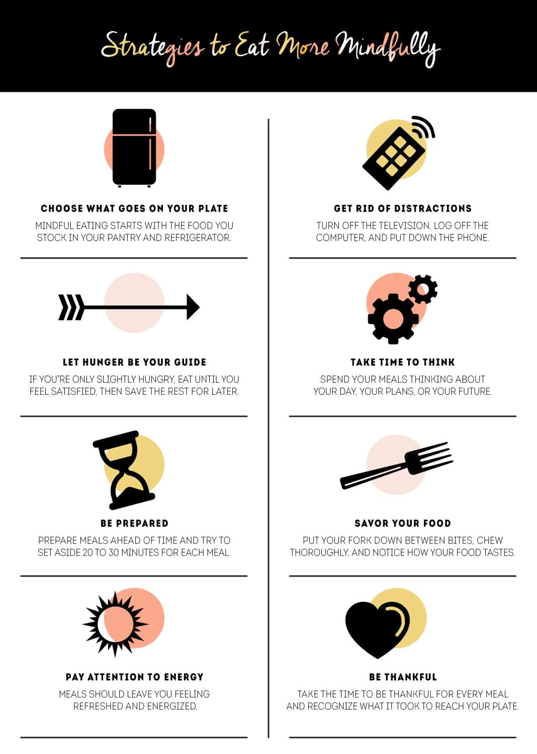 Mindfulness isn’t about perfection. It’s about recharging your life and creating more awareness. Work each day to improve your relationship with food through mindfulness and realize that every meal won’t always go according to plan. Stick to the strategies that work best for your situation and you will develop better eating habits over time.