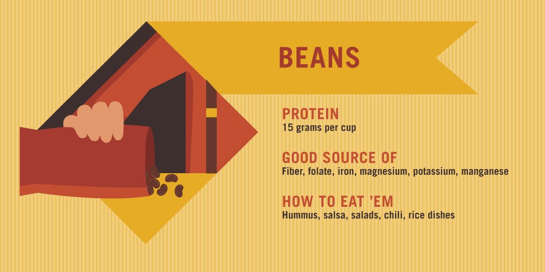 Notorious for their not-too-flattering side effects (soak in water and rinse to help reduce gas-producing enzymes), beans are an economical and versatile source of protein, fiber, and complex carbohydrates. Providing an average 15 grams of protein per cup, beans are a hearty and lean protein that can easily fit into a plant-based diet. Turn chickpeas into hummus, make a black bean salsa, add pinto beans to a salad, toss with brown rice, or make a multibean chili.