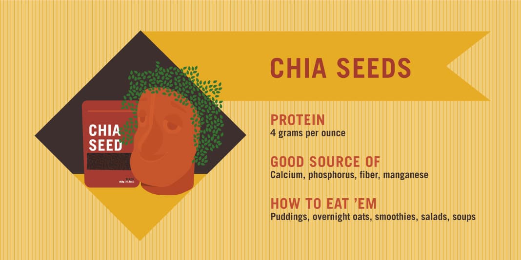 Chia seeds come in black and white varieties and provide a hearty dose of fiber in addition to 4 grams of protein per ounce. Chia seeds absorb up to 27 times their weight in water (or any liquid), which makes them a great thickening agent. Chia seeds can be used for puddings, overnight oats, smoothies, salads, and soups.