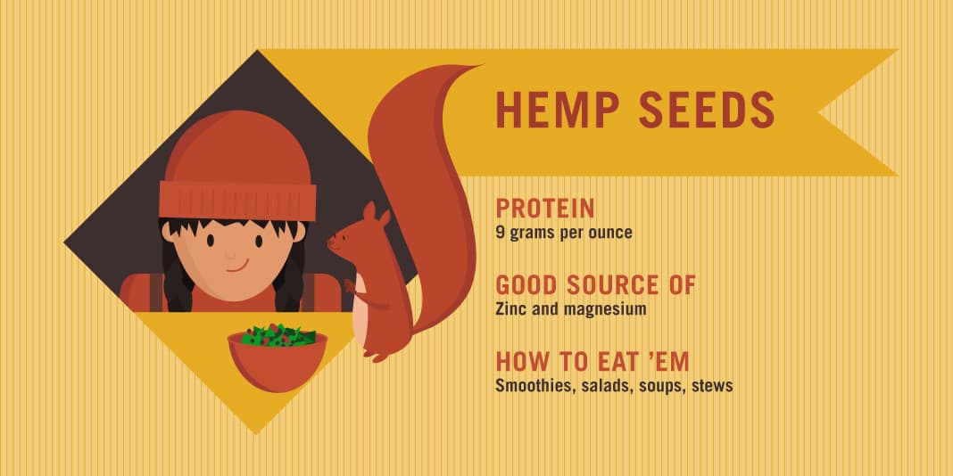 These little seeds are rich in protein, with 9 grams in every ounce. They’re also a good source of heart-healthy omega-3 fatty acids. Subtle in flavor, hemp seeds are a great addition to smoothies, salads, soups, or stews.