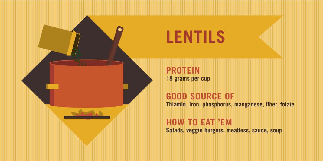 Lentils are another fantastic, economical plant-based protein. These small but mighty legumes are simple to cook and loaded with numerous nutritional benefits. Lentils are high in dietary fiber, which help with digestion, satiety, and cardiovascular health. Lentils are also a good source of vegetarian iron, an essential mineral for oxygen transportation in the blood and proper metabolism. Pairing an iron-containing food with vitamin C assists with optimizing iron absorption. Lentils are a combination of protein, carbohydrate, and fiber and provide 18 grams of protein in one cup. Add to a grain salad, veggie burgers, meatless sauce, or soup.