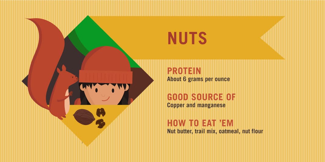 Cashews, almonds, peanuts (technically a legume, but you can find them with other nuts), walnuts, and pistachios all fall into the nut category. Nuts are rich in vitamins and minerals as well as healthy fats, and contain anywhere from 5 to 7 grams protein per ounce. Spread some nut butter on a banana or toast, make a trail mix, top your oatmeal, or grind into gluten-free flour.