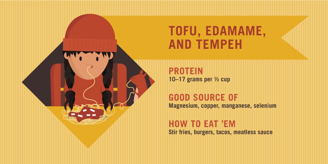 All three of these food sources are made from soybeans. Soy is a complete protein, meaning it contains all of the essential amino acids and provides between 10 to 17 grams per ½ cup serving depending on the source. Try to avoid processed, genetically modified, and soy byproducts by carefully reading labels. Opt for natural and fermented sources such as organic edamame, tempeh, and tofu. Edamame can be used similarly to beans, made into hummus, or added to salads. Tempeh or tofu can be sautéed into a stir-fry, crumbled into burgers, added to tacos, or substituted for meat in a meat sauce.