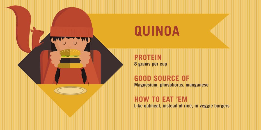 South American in origin, this seed, which is consumed like a grain, is high in protein and fiber. One cup of this gluten-free carbohydrate contains 8 grams of protein and is a good source of iron and magnesium. Quinoa is a terrific substitute for rice, can be used in stir fries, can be added to oatmeal for a multigrain breakfast, or can be used to make veggie burgers.