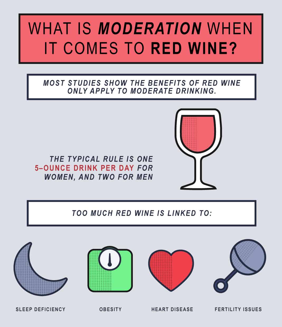 Turns out too much of a good thing can really be a bad thing. The key to reaping the benefits of wine really comes down to two things: Drink red (which contains resveratrol) over white and stick to moderate servings. The definition of moderation varies, but the typical rule is one drink per day for women and two for men.