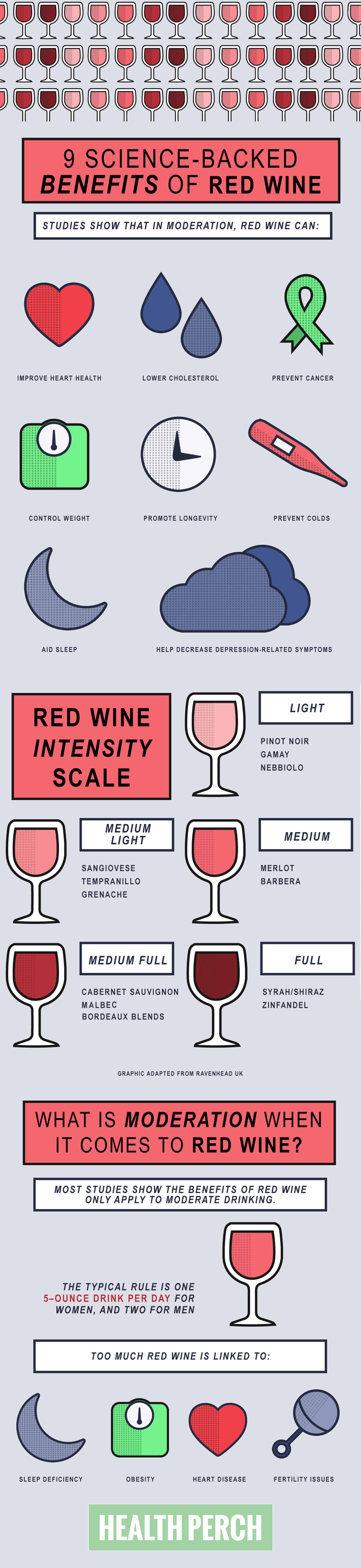 Most of wine’s benefits stem from resveratrol, a type of plant compound with high levels of antioxidants called polyphenols. Only red and purple grapes contain resveratrol, which is why researchers mostly tout the healthy advantages of red wine. And while there are supplements available, isolating resveratrol doesn’t provide the same benefits as a glass of vino in its natural state.