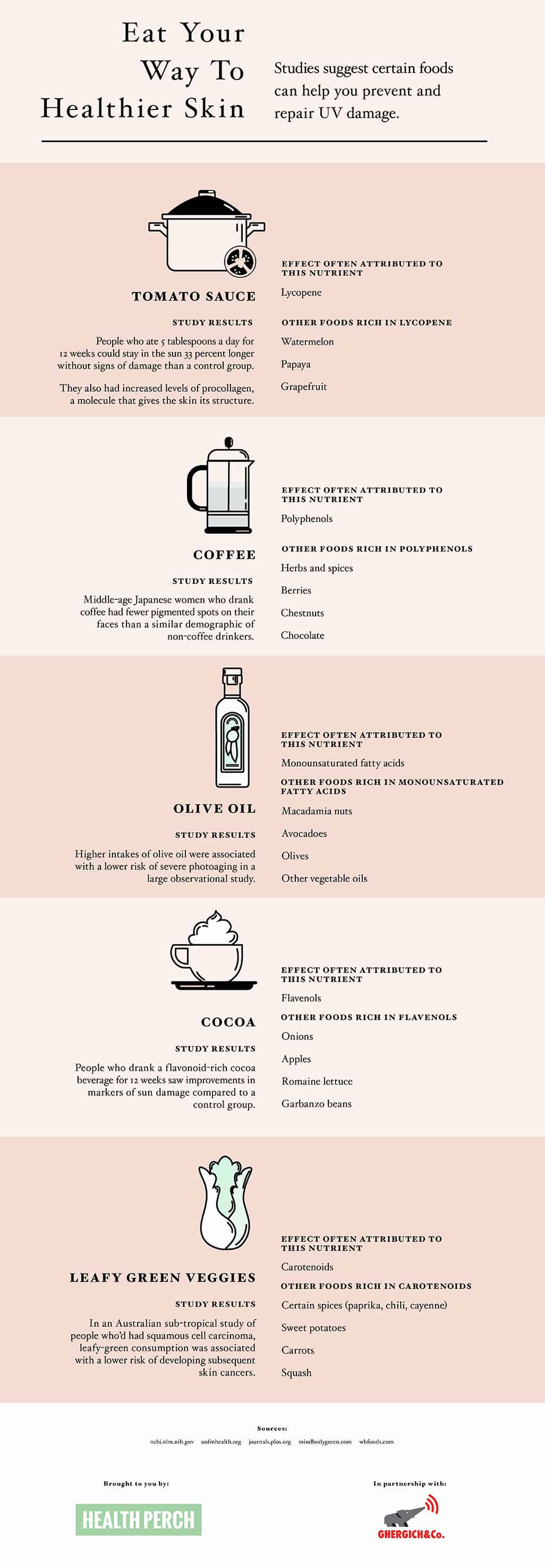 When it comes to skin health, you are what you eat. Noshing on foods rich in vitamins C and E, lycopene, lutein, beta carotene, and other antioxidants may help protect your cells from UV damage and repair existing damage. The best part? Antioxidant-rich foods are ripe and abundant in the summertime when most people need the most defense from UV rays. These foods include tomatoes, peppers, carrots, fruit, berries, melons, and dark green leafy veggies. Your sun-damaged skin may also be craving some other delicious, nutritious foods. Chocolate, anyone?
