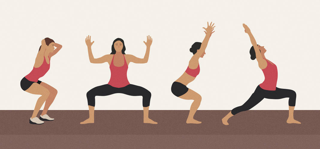- Stand tall, stepping the right foot out into a wide stance. Turn the toes out so the feet rest at a 45-degree angle. Bend at the knees, sinking the hips toward the floor into a strong squat position. Bring the arms out to shoulder height, bending at the elbows and spreading the fingers.