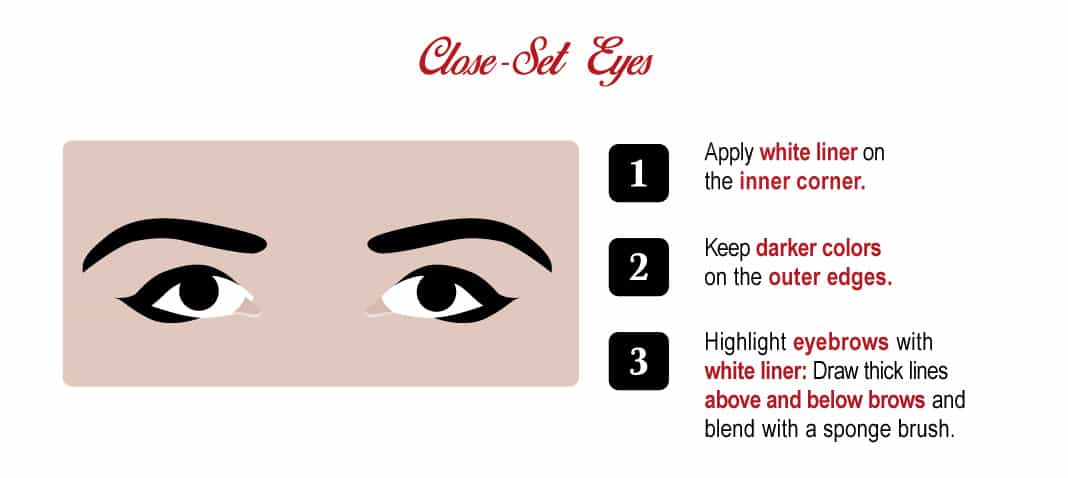 If you have close-set eyes, apply white liner on the inner corners of your eyes and keep darker colors on the outer edges to give the illusion that your eyes are set wider apart. Use the same white to highlight eyebrows: Draw thick lines above and below brows, and blend with a sponge brush.
