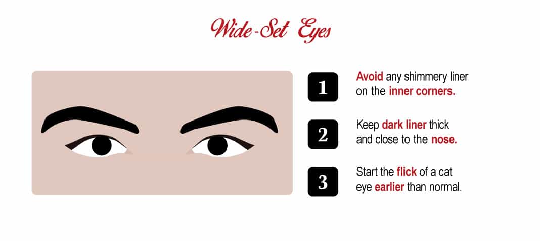 If you have wide-set eyes, avoid shimmery liner on the inner corners, which can emphasize the space between your eyes. Keep dark liner thick and close to your nose and start the flick of a cat eye earlier than normal. Beginning it earlier can make your eyes appear closer together.