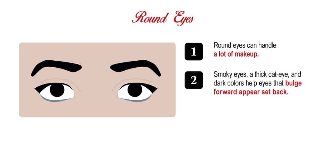 Round eyes can handle a lot of makeup, so have fun. Elongate eyes with edgy liner looks such as extended wings at the outer corners or smudged liner on the upper and lower lash lines. Smoky eyes, a thick cat-eye, and dark colors help eyes that bulge forward appear set back.