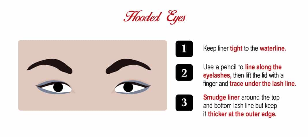 Hooded eyes can look tired because of their deep creases. They appear to have extra skin that hides the eyelid. Keep liner tight to the waterline; otherwise it won’t be visible when your eyes are open. Use a pencil to line along the eyelashes. Then instead of swiping across just above the lash line, lift your eyelid with your finger and trace under the lash line. The subtle liner will make eyelashes appear thicker. If you want to give the illusion of larger, curved eyes, smudge liner around the top and bottom lash line but keep it thicker at the outer edge. The smoky effect combined with several coats of mascara will open up hooded eyes.