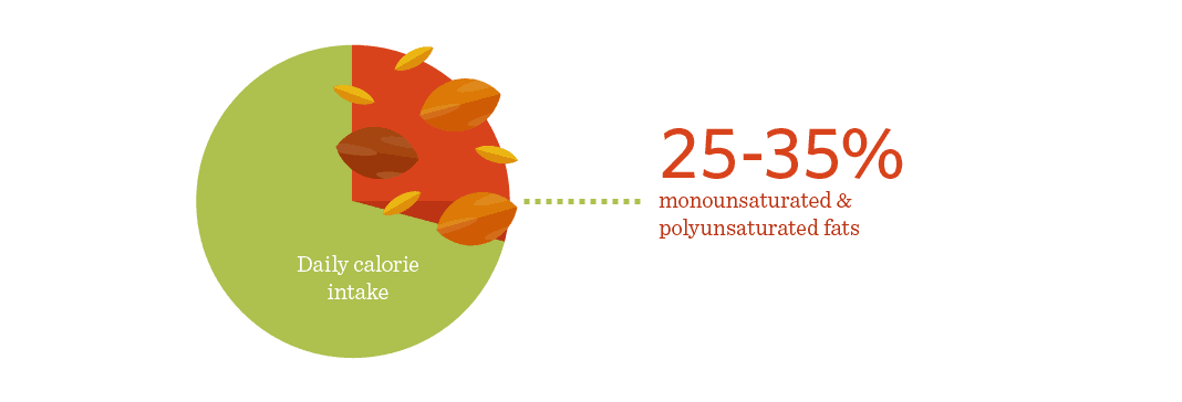 Monounsaturated and polyunsaturated fats should make up most of your daily fat intake which, according to the American Heart Association, should amount to 25-35% of your daily calories.